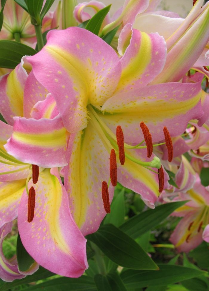Лилия Экзотика (Восточный гибрид) – луковичное растение высотой 90см. Стебли светло зеленые с 6-9 цветками, листья очередные. Направленные вверх цветки – лилово-розовые с желтыми полосами, диаметром до 18см, с сильным ароматом. Цветет в июле-сентябре. Используют в групповых посадках, миксбордерах, клумбах и на срезку.