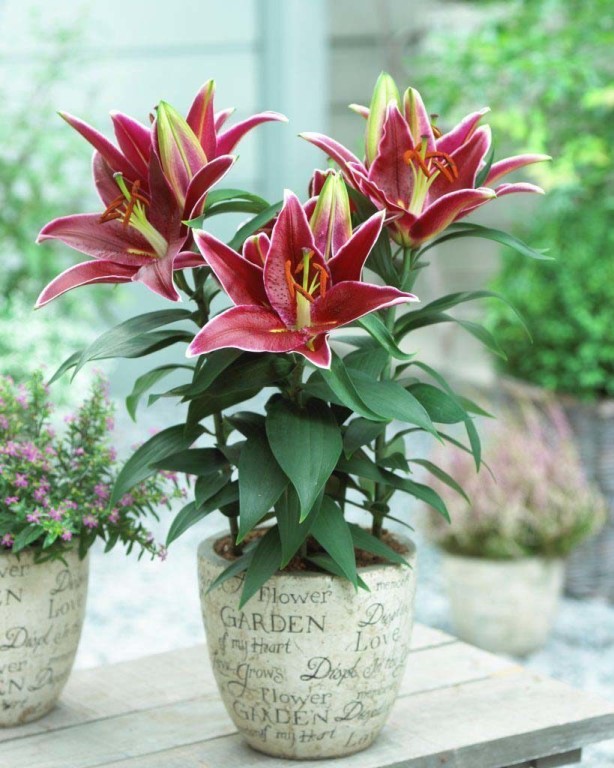 Лилия Магни Корз (Восточный гибрид) – луковичное растение высотой 90см. Стебли светло зеленые с 6-9 цветками, листья очередные. Направленные вверх цветки – тёмно-бордовые с белой каймой, диаметром до 24 см, с сильным ароматом. Цветет в июле-сентябре. Используют в групповых посадках, миксбордерах, клумбах и на срезку.