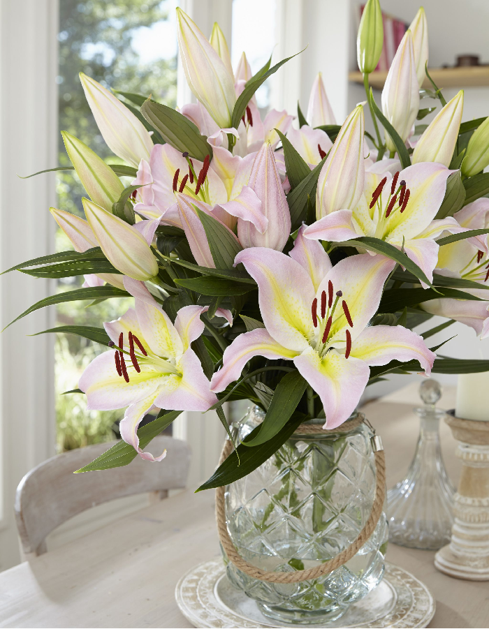 Лилия Фокус Покус высотой 110 см. Цветок очень крупный, нежно-розовый, с легким сиреневым оттенком, по центру лепестков широкие желтые лучи, диаметр цветка до 30 см. Зацветает в июле-августе. Имеет приятный аромат.