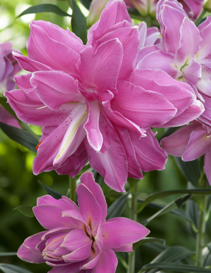 Лилия Лотус Уандер – это высокорослое растение элегантной формы. В благоприятной среде растение достигает высоты 100-110 см. Для культуры характерны пряморастущие мясистые стебли, хорошая облиственность огромными удлиненно-заостренными листьями зелено-изумрудного окраса, а также стройные цветоносы и развитое корневище. Листовые пластины, густо расположенные на стеблях, выделяются мясистостью, выраженным жилкованием и блеском поверхности. Цветоносы значительно выделяются над лиственной массой. На них формируются крупные вытянуто-заостренные бутоны, раскрывающиеся невероятно красивыми цветками. Относится лилия к крупноцветковым – диаметр каждого экземпляра варьируется в пределах 17-21 см. У махрового цветка необычная форма, напоминающая лотос с эффектно сложенными лепестками, а также множество одинаковых лепестков с волнистыми краями и бархатистым напылением. На поверхности лепестков виднеется легкая гофрированность. Изюминкой новой разновидности является не только необычная форма, но и красивый окрас – ярко-лиловый фон разбавлен малиновым крапом. Завершает образ лилии белоснежная кайма, аккуратно обрамляющая каждый лепесток. Цветущая культура наполняет все вокруг приятным, довольно интенсивным ароматом. Для культуры тщательно выбирается место, где много света, тепла и солнца, а также есть защита от сквозняков. На одном месте без пересадки культура растет 3-4 года, а потом ее следует рассаживать.