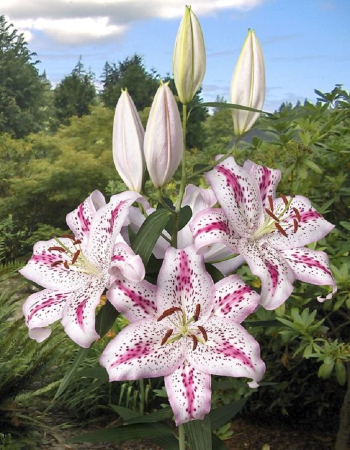 Восточные лилии создают неповторимую роскошь и обволакивают сад пьянящим ароматом. Их огромные соцветия-колокола в разы крупнее, чем у азиатских, видовых или тигровых лилий, а яркая расцветка с характерным крапом делает их самыми узнаваемыми среди остальных групп лилий.