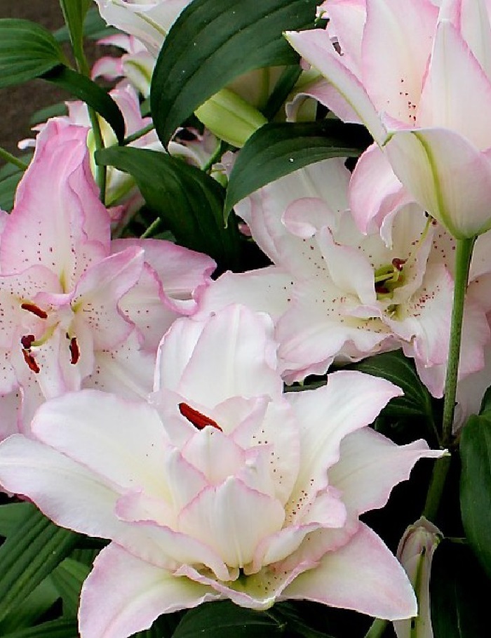 Цветы у данной разновидности лилии крупные. Бутон своей формой напоминает объемный колокол. Диаметр цветка – 20-22 см. Лепестки у лилии махровые. Окрашены они в нежный белый цвет. Края у лепестков светло-розовые. Такое сочетание цветов выглядит очень изящно.Представители этого сорта цветут в период с июня по август. От цветов исходит сильный пьянящий аромат.