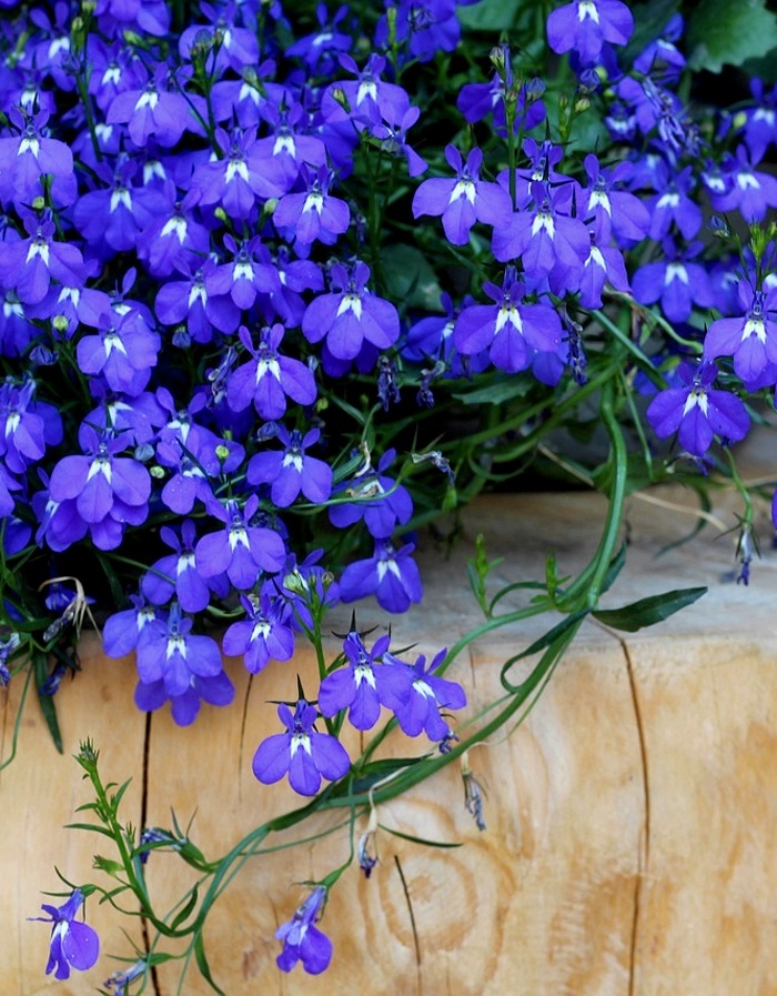 Ранняя серия ампельной лобелии. Изящный однолетник с большим количеством ниспадающих побегов и обилием цветов, расположенных в пазухах листьев, длиной до 35 см. Стебли сначала растут вверх, а потом ниспадают через край ёмкости. Растение образует изящный каскад с множеством ярких цветков. Цветки необычной формы, насыщенно синие с белым глазком, диаметром до 2 см. Обильно цветет с середины июня по октябрь. Используют для кашпо, вазонов, балконных ящиков, террас. Также высаживают с другими цветущими однолетниками, создавая удивительные контрастные композиции.