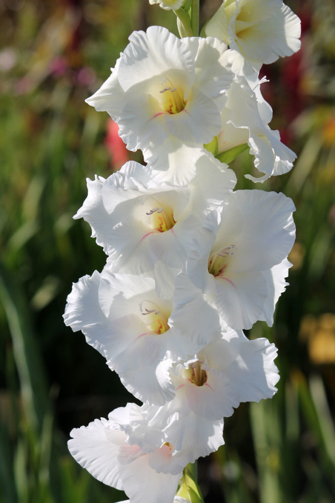 Данный гладиолус входит в топ-10 самых лучших сортов для срезки. Он славится своими крупными белоснежными цветками. Серединка цветка – салатового цвета. Цветки сидячие с простым воронковидным околоцветником из шести неодинаковых долей, сросшихся основаниями, различной величины и формы. Цветки расположены близко и симметрично на прочных цветоносных стеблях. Они образуют колосовидно соцветие. Лепестки взъерошены и напоминают воздушный зефир. Стебли растения крепкие, прямостоячие, мясистые и покрыты продолговатыми, тонкими, ланцетными листьями (стебли гладиолусов нужно подвязывать). ождения. Его можно выращивать как в открытом грунте, так и в контейнерах.