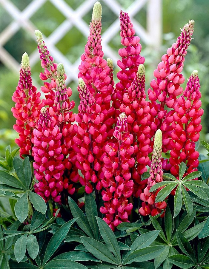Люпин Фламинго – нарядный многолетник высотой до 90 см с несколькими цветоносами, венчающимися плотными карминово-розовыми многоцветковыми кистями длиной до 40 см. В нижней части растение украшено длинными черешками с пальчато-сложными листьями. Благотворно влияет на почву, обогащая ее азотом. Люпины разной окраски эффектно смотрятся в цветнике, при этом требуют минимум усилий.