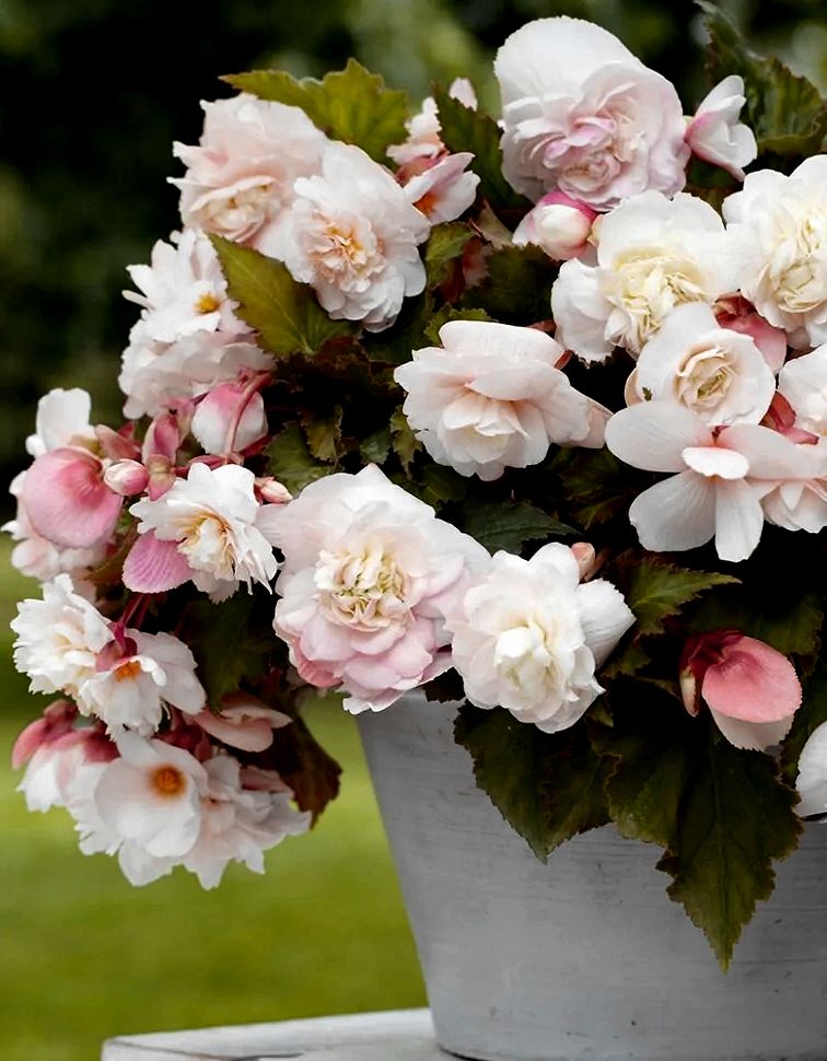 Бегония Ароматная бело-розовая – клубневое растение со свисающими побегами длиной 18-20см. Красивы ее зеленые сердцеобразные листья с неровно зубчатыми краями, прекрасны и ароматные махровые цветки розово-белой окраски, похожие на розочки, диаметром 8-10см.