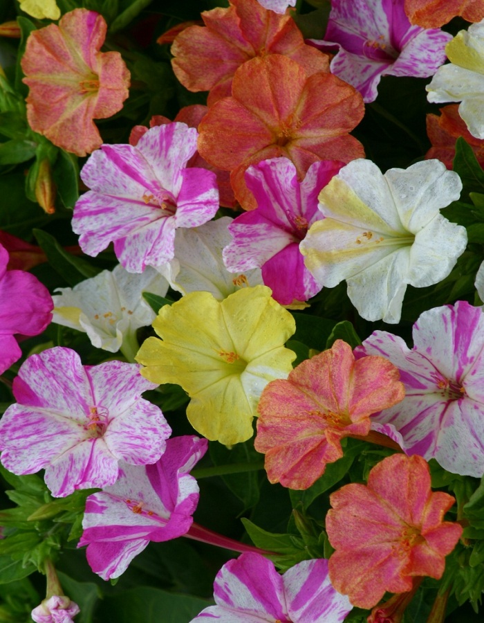 Очаровательная смесь обильно цветущих однолетников с изящными душистыми цветками необычных ярких расцветок с насыщенно темным жилкованием. На одном кусте могут быть цветки различных окрасок. Растения травянистые, с клубневидными вздутыми корнями, высотой до 60 см. Цветки воронковидные, по 3-5 в чашевидной обертке, собраны в щитковидные соцветия на концах побегов, диаметром до 2,5см.