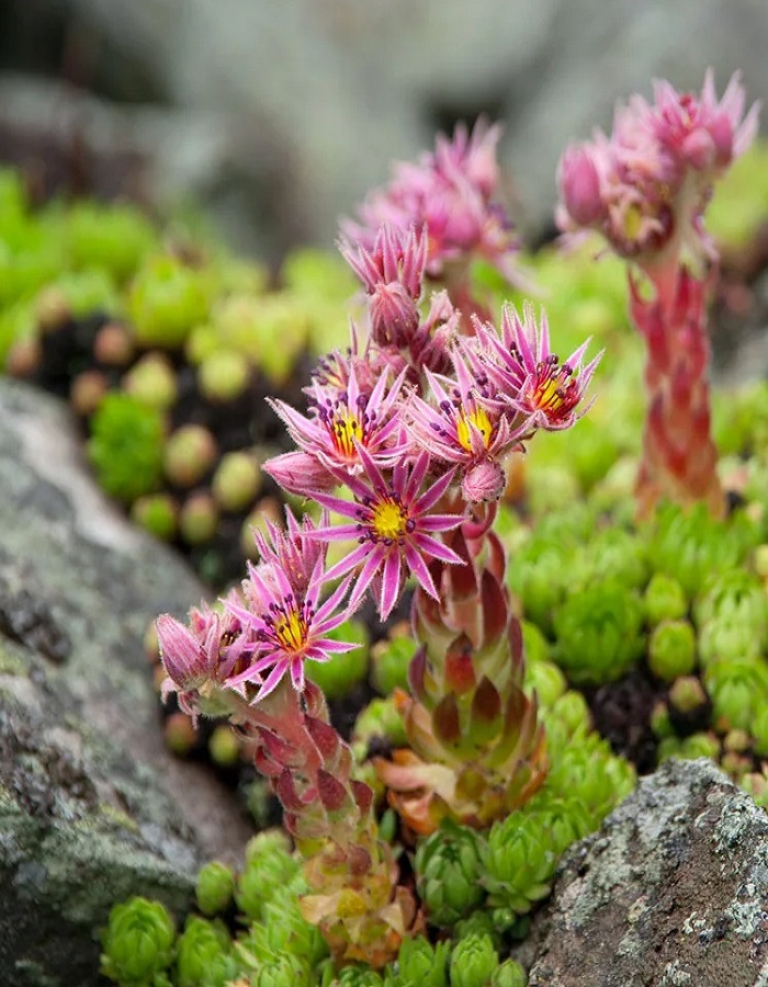 ПрименениеСуккулентное растение. Вид имеет декоративное значение. Также обладает противоэрозийными свойствами и влияет на обновления почвы. Выносливое растение, не боится морозов, поэтому с успехом выращивается на открытом воздухе, как в горшках, так и просто в почве, на различных ограждениях.Дерево (куст)Представляет собой многолетнее, образующее столоны растение. Стебли вырастают высотой 7-18 см. Имеет тонкие ползучие корневища. Образовывает куст из многочисленных вегетативных и генеративных особей, которые формируются в пазухах листьев, расположенных розеткой.ЛистьяМонокарпические розетки в форме звезды диаметром 1-3 см имеют запах смолы и образовываются мясистыми, суккулентными противоположно расположенными темно-зелеными листьями с пурпурным кончиком. По краям листьев расположены длинные ресничные волоски.Цветы (соцветия)Цветоносные стебли вырастают высотой 5-8 см, выбрасывают цветы на верхушке стебля от 3 до 10 шт в диаметре до 3,5 см. Венчик образован 10-15 лепестками, преимущественно пурпурно-фиолетового цвета с темными прожилками. Цветет в июле-августе, плодоносит в августе.ЗимостойкостьЗимостойкость высокая, до -40° сВозраст саженца1 годУсловия выращиванияВ качестве культурного растения выращивают в каменистом, едва кислом субстрате на ярком солнце..