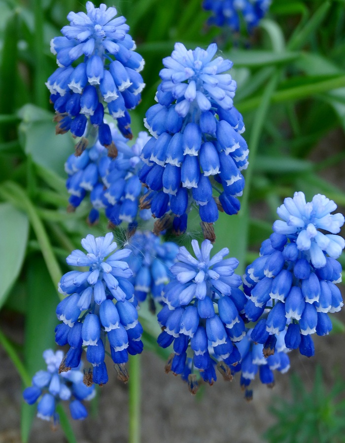 Мускари Артист, это низкорослое (15—20 см) растение. Нераспустившееся соцветие похоже на зеленую виноградную кисть. Цветы пестрые, синие с белой каймой по краю.