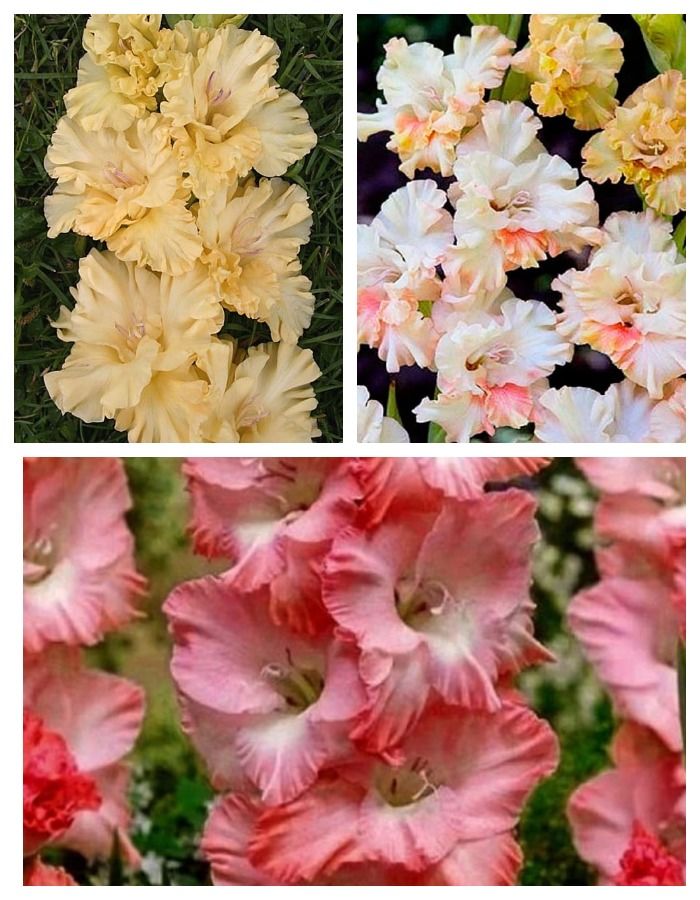 Гофрированный гладиолус - это настоящий пышный букет, а если таких гладиолусов несколько - это настоящий фейерверк цветов. Нежные, спокойные оттенки цветов, диметром до 14 см. Готовый букет для срезки. Данная подборка будет элегантным величественным фаворитом вашего сада.