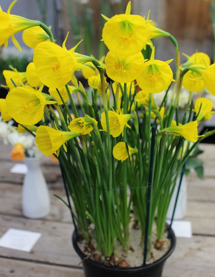 Миниатюрный и ранний ботанический нарцисс бульбакодиум с необычными цветками вполне достоин быть символом Весны! Главная деталь - огромная Корона 4 см в диаметре и более! Доли околоцветника превратились в небольшую золотую звёздочку в основании Короны. Одна луковица подарит, аж, 3-5 ароматных Корон-граммофонов, обращённых к солнцу. Небольшая цветущая группа - трубачи, исполняющие гимн Весне. Волшебное зрелище!