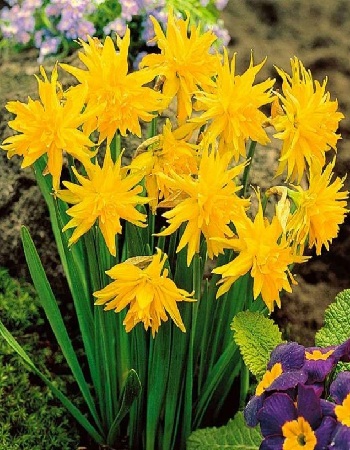 Нарцисс Рип ван Винкль. Доли околоцветника имеют яркую желтую окраску и достаточно острые кончики. А выросты коронки образуют махровый центр цветка. По виду они больше похожи на георгины, чем на своих «собратьев». В зависимости от климата лепестки могут иметь большее или меньшее количество зеленых бликов и вкраплений. Довольно неприхотливы, продолжительность цветения - 10 дней. Высота: 20 см. Срок цветения: апрель-май. Очень широко используется в садовом дизайне на клумбах в группах с другими многолетниками и отдельными посадками. Предпочитают влажную почву и при условии организации дренажа не боятся избыточной влаги или талых вод в осенне-весенний период, отлично развиваются на тяжелых и суглинистых почвах.В грунт высаживать в сентябре на глубину 10–15 см, в зависимости от размера луковицы, выдерживая расстояние 10–20 см.Уход заключается в своевременных поливах, рыхлении, подкормках, прополке сорняков.Первую подкормку проводить весной по всходам, вторую — в фазе выхода цветоноса, третью — во время полной бут