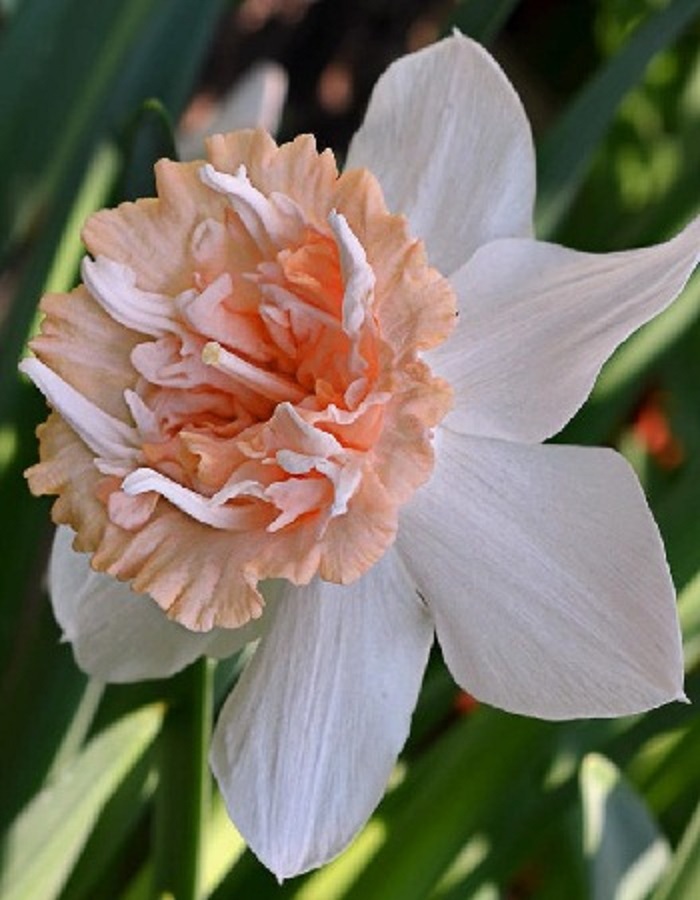 Нарцисс Петит фо - высота растения 40 см. Крупная коронка причудливой формы имеет отогнутые волнистые края с золотой каймой, в начале цветения ярко-желтая, в полном «расцвете» - кремово-розовая c с абрикосовыми шртихами, после - белая. Лепестки кремовые с зеленоватый оттенком. Зацветает в апреле. Цветки достигают 12 см. в диаметре. Продолжительность цветения - 9-18 дней. Агротехника. Предпочитают влажную почву и при условии организации дренажа не боятся избыточной влаги или талых вод в осенне-весенний период, отлично развиваются на тяжелых и суглинистых почвах. В грунт высаживают в сентябре на глубину 10-15 см, в зависимости от величины и сорта, выдерживая расстояние 10-20 см. Уход заключается в своевременных поливах, рыхлении, подкормках, прополке сорняков. Первую подкормку проводят весной по всходам, вторую — в фазе выхода цветоноса, третью — во время полной бутонизации, четвертую — во время цветения. Выкапывают в сухую погоду, предварительно прекратив поливы на участке, когда увядшие листья уже начнут засы