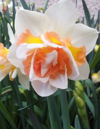 Нарцисс «Реплит». Высота 30-35 см. Диаметр 8-9 см. Цвет белый с оранжевым. Агротехника. Предпочитают влажную почву и при условии организации дренажа не боятся избыточной влаги или талых вод в осенне-весенний период, отлично развиваются на тяжелых и суглинистых почвах. В грунт высаживают в сентябре на глубину 10-15 см, в зависимости от величины и сорта, выдерживая расстояние 10-20 см. Уход заключается в своевременных поливах, рыхлении, подкормках, прополке сорняков. Первую подкормку проводят весной по всходам, вторую — в фазе выхода цветоноса, третью — во время полной бутонизации, четвертую — во время цветения. Выкапывают в сухую погоду, предварительно прекратив поливы на участке, когда увядшие листья уже начнут засыхать. Полученные луковицы сортируют по размерам, отбраковывают пораженные, проводят термическую обработку и до посадки хранят в прохладном месте при t +8... +12 °С.