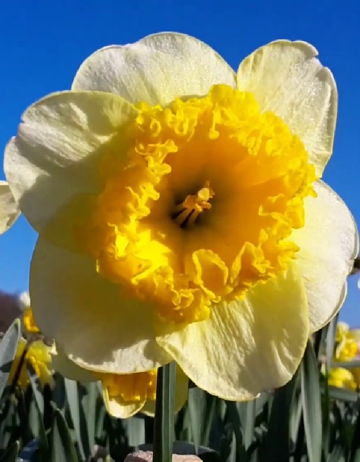 Нарцисс «Керли». Высота 35-40 см. Диаметр 8-10 см. Цвет бело-желтый с желтой гофрированной короной.