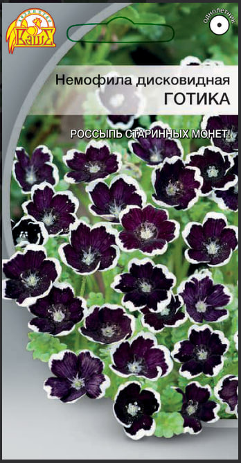 Россыпь старинных монет - вот что напоминает этот цветок. Растение однолетнее, невысокое, стелющееся по земле. На зеленом фоне листьев и стеблей то здесь, то там встречаются одиночные цветочки-диски фантастического черного цвета с белой серединкой и такой же контрастной каймой. Диаметр цветков - 2,5 см. Растение довольно прихотливо в выращивании, требовательно к плодородности почвы и поливу.