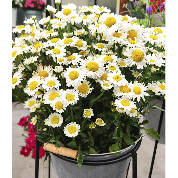 Раннецветущий многолетник, не требующий яровизации. Цветение в первый год после посева. Компактное растение высотой 35-40 см, с прямостоячим габитусом. Хорошо ветвится, образует множество классических белых цветков с желтой серединкой.