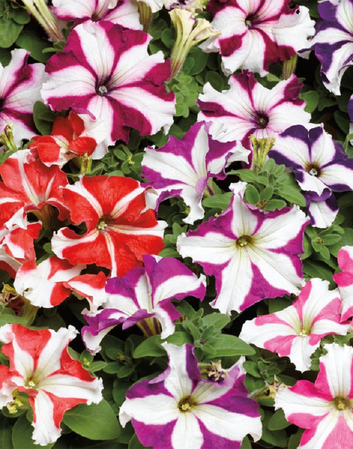 Семена Петунии грандифлора Тритуния Стар Микс используют для создания ярких клумб. Высотой 20-25 см и диаметром 9-11 см. Такие цветы хорошо будут смотреться в парках, на верандах, возле детских игровых центров, кафе или ресторанов. Нежные, изящные цветы в самых разнообразных оттенках, от розовых до темно-фиолетовых. Отличительной особенностью этого сорта является наличие белых лучей, расходящихся к краям из центра бутона. Такие композиции смотрятся еще более интересно и необычно. Неприхотливое растение, которое практически не требует участия весь период цветения куста.