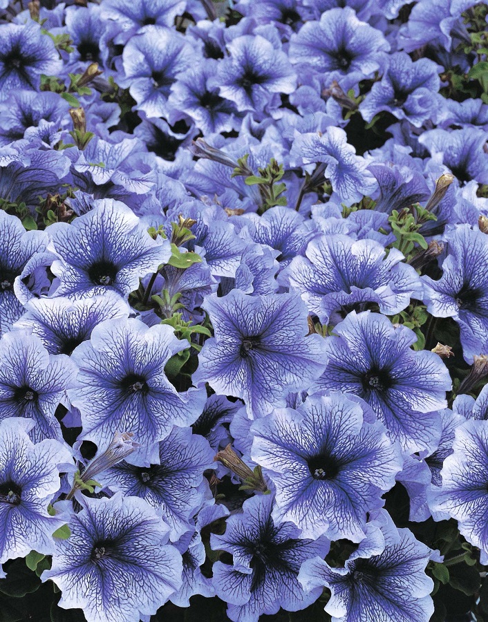 Превосходная серия крупноцветковой петунии Дедди (Daddy) отличается серебристо-синими оттенками, которые получаются благодаря прожилкам более темного тона на цветках.Имеет очень крупные колокольчатые цветы размером 7-9 см. Лепестки красивого сиреневого цвета, а по середине у них ярко-фиолетовые прожилки. Само растение размером всего 25-30 см, устойчиво к непогоде и хорошо сочетается с другими видами цветов.