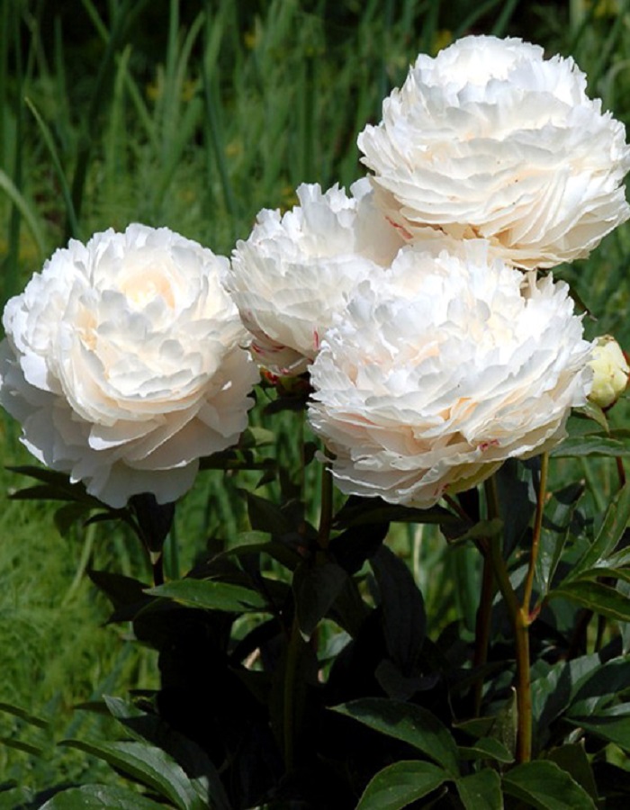 Многолетняя травянистая культура достигает в высоту 1 м. Куст хорошо разветвленный, с прочными и ровными стеблями. По всей длине он покрыт мясистыми, насыщенно-зелеными листьями. Листовые пластинки имеют удлиненную форму и слегка заострены на концах. В среднем их размер составляет 30 см. Бутоны махровые, шаровидные и крупные. Распускаясь они превращаются в пышные цветки, шириной до 19 см. Лепестки белоснежные или с едва заметным кремовым оттенком.