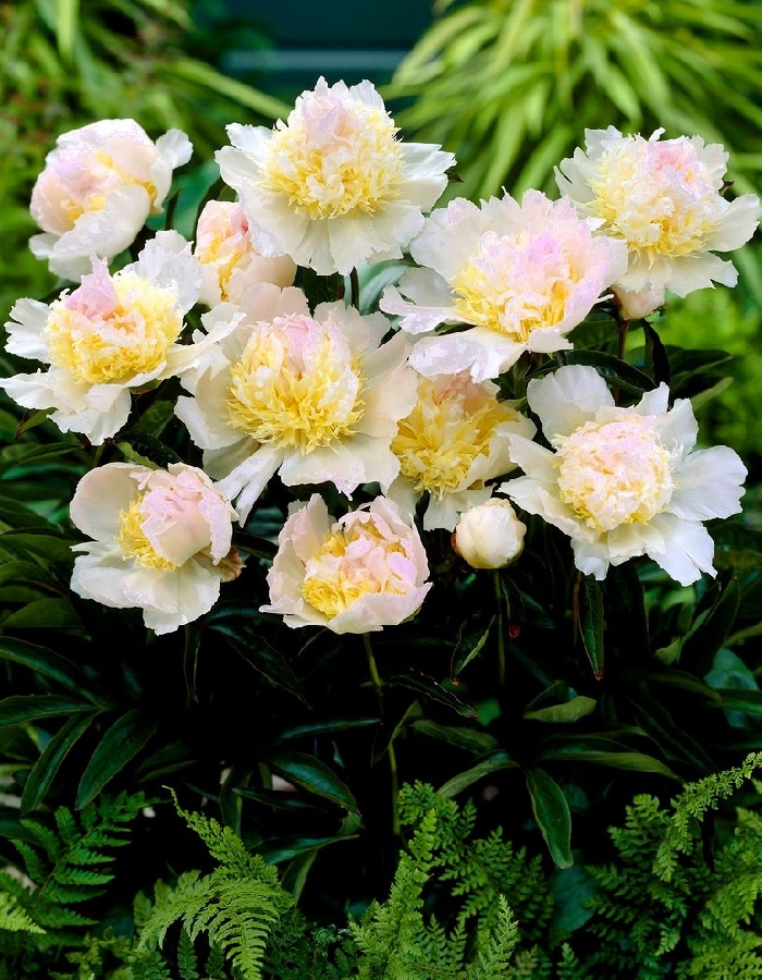 Пион Топ Брасс – травянистое растение с прочными стеблями и мощными мясистыми корнями достигает высоты 105см. Листья крупные, очередные, трижды тройчатые, темно зеленые, блестящие. Цветки махровые, белые с желтовато-розовым центром, слегка душистые, диаметром до 20см. Цветет в июне – июле. Используют в одиночных и смешанных посадках, группами среди газона. Шикарно смотрится в букетах и композициях.
