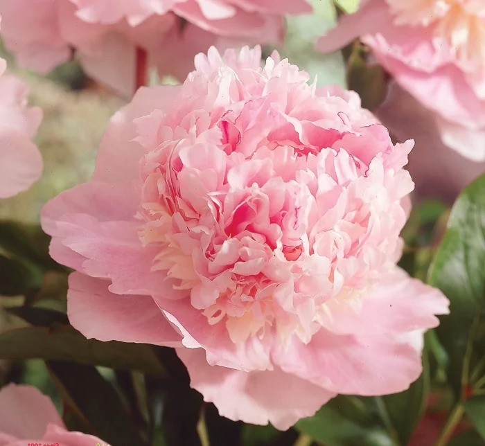 Нежный махровый цветок пиона привлекает к себе сильным сладким ароматом, напоминающим благоухание дамасской розы.