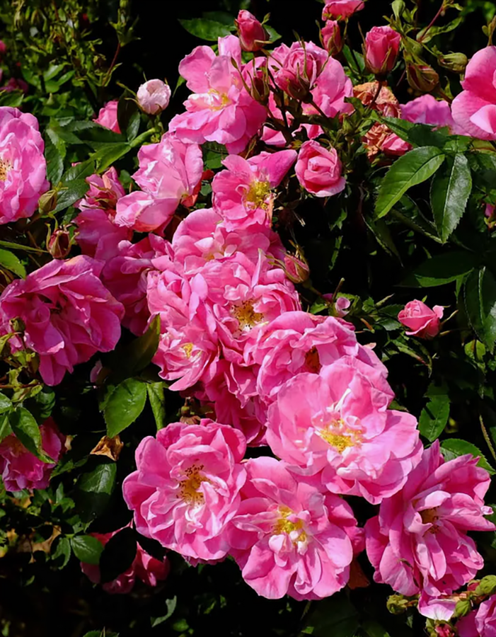 Описание< Роза Вильям Баффин канадская парковая (лиц) - обильно и продолжительно цветущая, очень устойчивая к болезням ярко-розовая роза. Цветок розы Уильям Баффин ярко-розовый, в центре белый с желтыми тычинками, плоский, полумахровый (15 - 20 лепестков), обладает легким фруктовым ароматом. Цветение обильное, продолжительное, повторное. Цветки собраны в соцветия, на одном цветоносе в период массового цветения насчитывается 15 - 30 цветков одновременно. Растение мощное, сильнорослое. Лист мелкий, зеленый, глянцевый. Роза William Baffin , хорошо переносит жаркое засушливое лето, может расти в тени. Сорт очень устойчив к заболеваниям. Мировые награды: победитель многих конкурсов Американского общества розоводов AARS, 1999 – 2001.