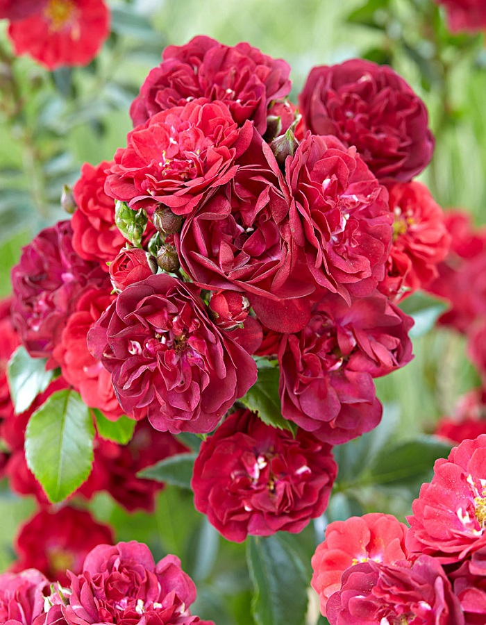 ОписаниеЦветки полумахровые,форма роз изменяется в процессе цветения от конического бутона до плоскочашевидной. Цветки имеют окрас от темно-розового до малинового с бордовым оттенком и желтые тычинки. Они собраны в большие соцветия, состоящие из 9 — 15 бутонов.Цветение роскошное и обильное, с небольшими перерывами. Аромат слабый.