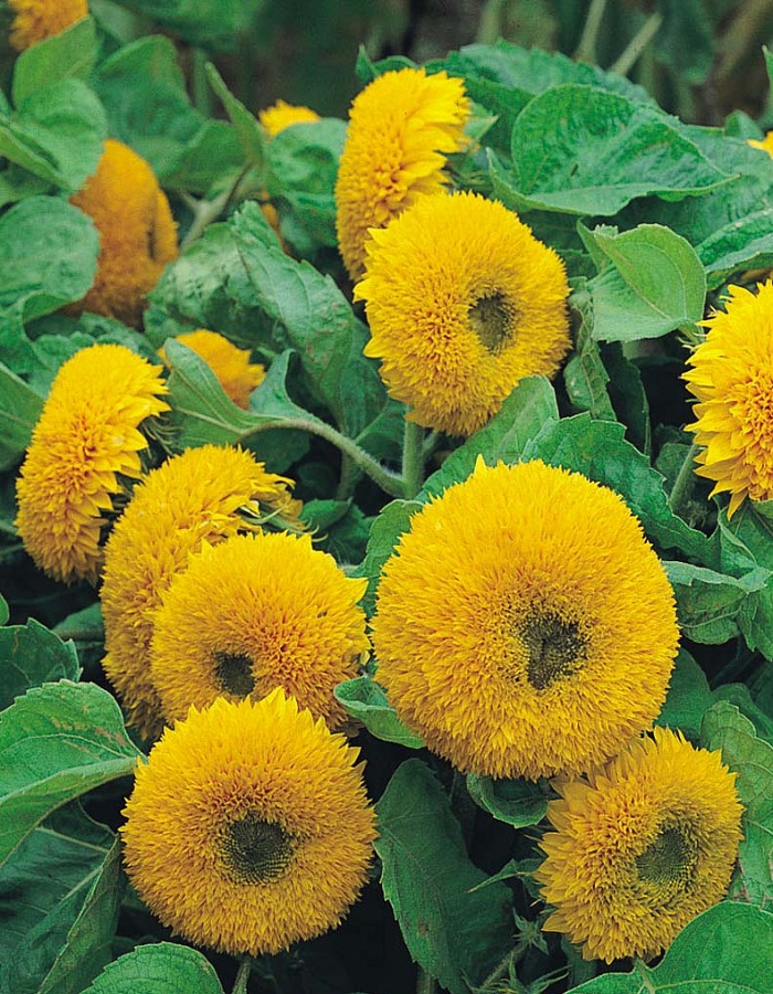 Богатое, яркое цветение. Декоративное растение высотой 50-60см. Листья крупные, с заостренной верхушкой, по краю пильчатые. Соцветия махровые, диаметром до 10см, золотисто-желтого цвета.Растение теплолюбивое, предпочитает солнечные места. Цветет с середины июля по сентябрь. Используют в декоративных и маскировочных группах, а также для срезки.