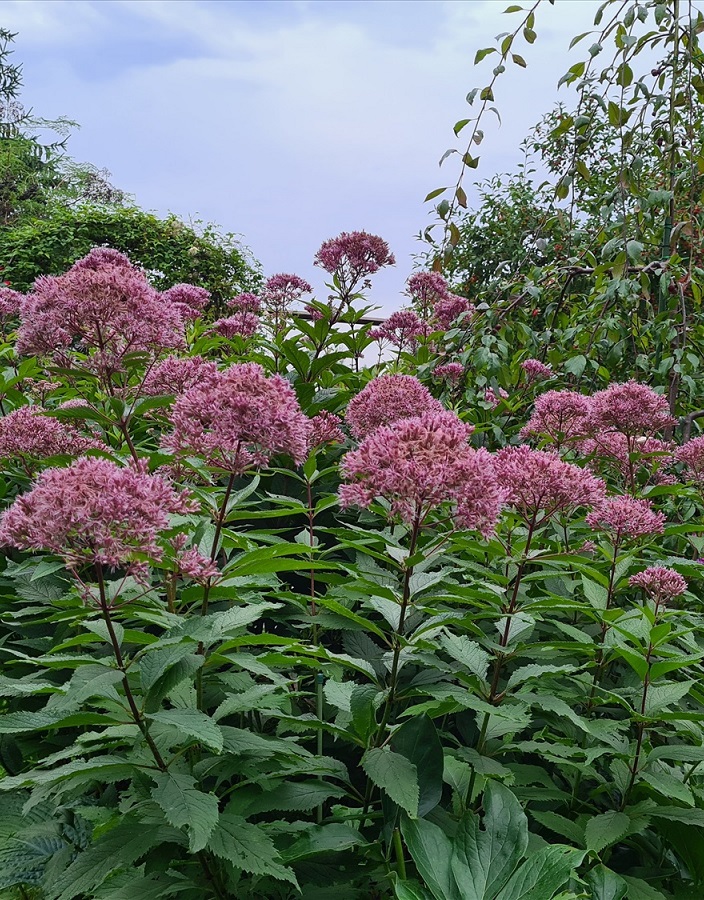 ПрименениеНеприхотливое растение является самостоятельным элементом ландшафтных композиций при формировании ярусности клумб и живых изгородей. Цветок часто используют в практических целях, искусно маскируя им неприглядные строения и хозяйственные участки придомовой территории.Дерево (куст)Высокорослый, достигающий в высоту до 2-х м. Стебель посконника пурпурного имеет прямое крепкое строение и практически не ветвится. Корневище растения достаточно хорошо развито, что позволяет ему без труда удерживать разросшийся полукустарник, который со временем становится довольно тяжёлым.ЛистьяПо всей его длине расположены крупные продолговатые листья насыщенно-зелёного цвета с фиолетовыми либо сиреневыми прожилками.Цветы (соцветия)Цвести растение начинает в начале-середине августа и заканчивает ближе к октябрю. Небольшие цветки собраны в корзинки, которые во время цветения выглядят как объёмные цветущие шапки диаметром до 30 см. Плоды растения выглядят весьма необычно и представлены в виде хохлатых семянок, внутри которых находятся мелкие шершавые семена. Но даже после окончания цветения растение выглядит очень красиво и благородно. Стебель к этому времени приобретает розовый оттенок и смотрится довольно эффектно на фоне ярко-зелёных листьев.ЗимостойкостьЗимостойкость средняя, до -34°C.Возраст саженца1 годУсловия выращиванияСлегка затенённый или открытый солнечный участок, на котором присутствуют лёгкие рыхлые плодородные грунты. На супесчаных и глинистых почвах культура растёт немного хуже, начинает отставать в росте и поздно зацветает.