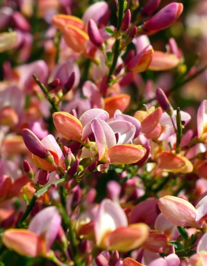 Ракитник Зеландия - декоративный кустарник. Достигает высоты 150 см и ширины 200 см. Весьма неприхотливый сорт с узкими листочками ярко-зеленого цвета. Цветет нежно-розовыми цветами, внутри имеющими персиковый оттенок. Период цветения апрель-май.