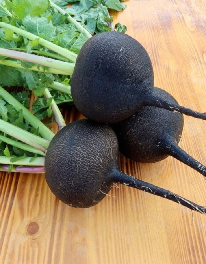 Период от всходов до уборки урожая 70-95 дней. Корнеплод черный, округлый, длиной 8-12 см, диаметром 9-13 см. Поверхность слегка бороздчатая. Мякоть белая, плотная, сочная, остро-сладкого вкуса. Масса 230-350 г. В почву погружен полностью, легко выдергивается. Розетка полураскидистая.