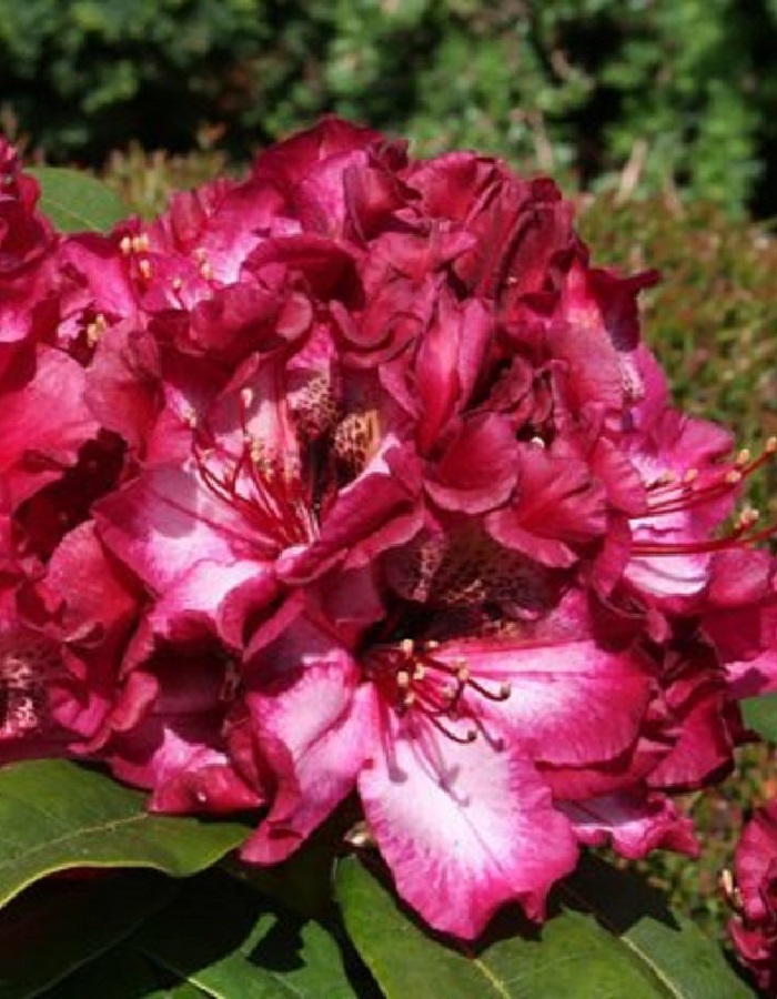 Вечнозелёный гибридный рододендрон. Очень популярный. Цветки 6-7-лепестковые, широко раскрытые, почти тарелочной формы, очень крупные, диаметром до 10 см, с изысканной игрой цветов, от тёмно-бордово-красной волнистой каймы через несколько размытый переход к сияющему белому центру. Центральные жилки лепестков часто бывают тёмно-красными. Кроме того, верхние лепестки украшены крупным красно-коричневым пятнистым рисунком, переходящим к краю в оранжевые или жёлто-зелёные тона. Очень крупные округлые плотные соцветия высотой 9-13 см и шириной 14-19 см состоят из 18-29 цветков. Цветение с середины мая до начала июня. Листья длиной 10-12 см, тёмно-зелёные, полуглянцевые. Куст широкий и компактный, к 10-ти годам высота 100 см и ширина 120 см. Морозостойкость до -22°С.