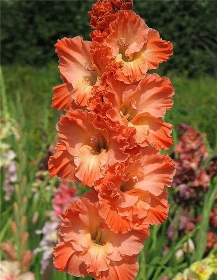 Одновременно на стебле распускается до 8 цветков, длина соцветия составляет около 80 см. Гладиолус относится к крупноцветковым видам и имеет диаметр цветка от 11,5 до 14 см. Лепестки плотные, гофрированные и широко открытые. Окраска цветков каштаново-лососевая.