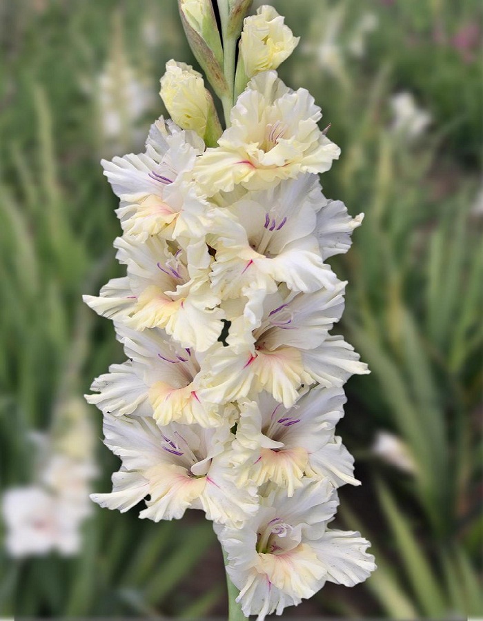 Бело-кремовый с малиновым напылением в горле. Гофрировка сильная. Фактура лепестков плотная. Размер цветков 15 см. Соцветие идеально двухрядное, длиной 70 см. В соцветии может быть 10 одновременно открытых цветков из 23. Стройный гладиолус высотой 150 см, мощный и красивый. Превосходная срезка. Срок цветения средний.