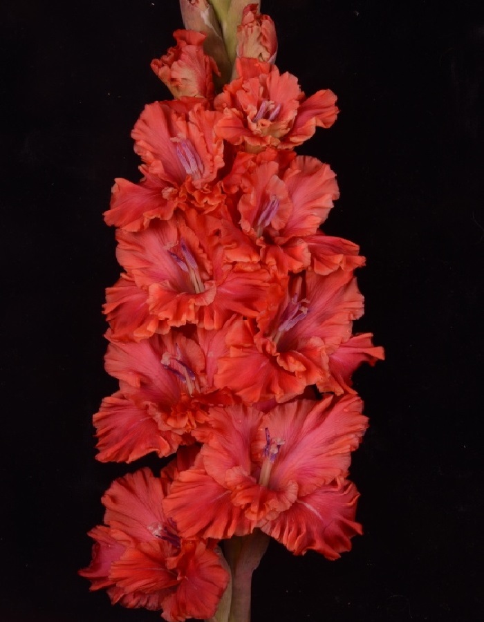 Гладиолус Винни Пух. Красный с тёмно-малиновой подсветкой нижних лепестков. Гофрировка сильная. Колос плотный. Цветки пушистые, размером 11,5-14 см. В соцветии может быть одновременно открыто 9 из 20 цветков. Срок цветения средний.