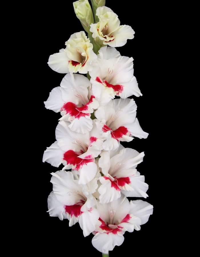 Высота 150–155 см. Соцветие 80 см, 24 бутона (одновременно открыты 9–10). Бутон 12,5–14 см. Чистого белого цвета с крупными наплывными малиново-красными пятнами по середине нижних лепестков, переходящими иногда по кругу на верхние лепестки и малиновым напылением в горле. Цветок гармоничен и ярок, округлый, гофрирован складками-защипами. Ткани шелковисто-матовые, прочные, устойчивы к любой непогоде и солнцу. Прекрасная срезка.