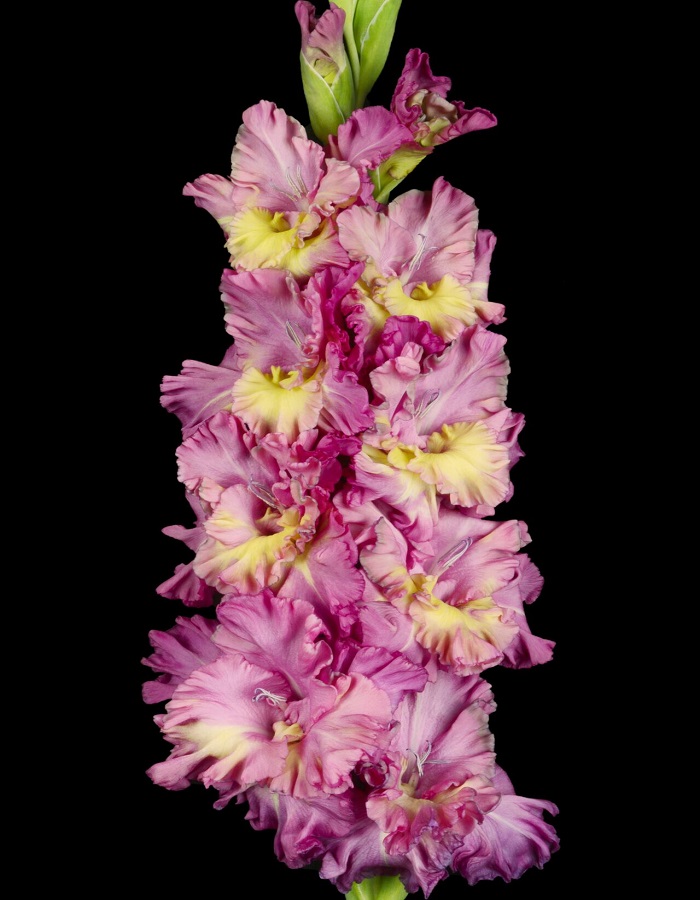 Высота 160 см. Соцветие 75 см, 21–22 бутона (8–9 одновременно открыты). Диаметр бутона 14 см. Насыщенно-сиреневый с салатным пятном в горле на нижних лепестках. Сильно гофрирован складками-защипами на 2/3 глубины лепестков. Ткани плотные, прочные, устойчивы к солнцу и дождю, чуть искрятся. Пышный, плотный идеально уложенный колос. Сорт — "мать-героиня". Из крупной луковицы до 7 стрелок.