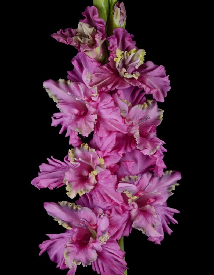 Гладиолус Инопланетянин - яркая неоновая окраска. Основной цвет лиловый. Внутренние лепестки волнообразные, с дымчатой каймой и кремовыми нерегулярными бликами.