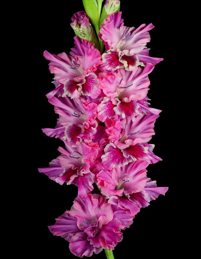 Гладиолус Сарафанное Радио. Великолепный сорт неонового лилового цвета с резной бахромой (сиреневый с более тёмным пятном и белой каймой на нижних лепестках). Супер сильно гофрирован крупными волнами и защипами, крупноцветковый. Цветки размером 11,5-14 см. На стройном, двухрядном колосе, состоящем из 21 бутонов, одновременно открыты 8-10 крупных цветков сочного окраса. Срок цветения средний. Высота растения достигает 140 см.