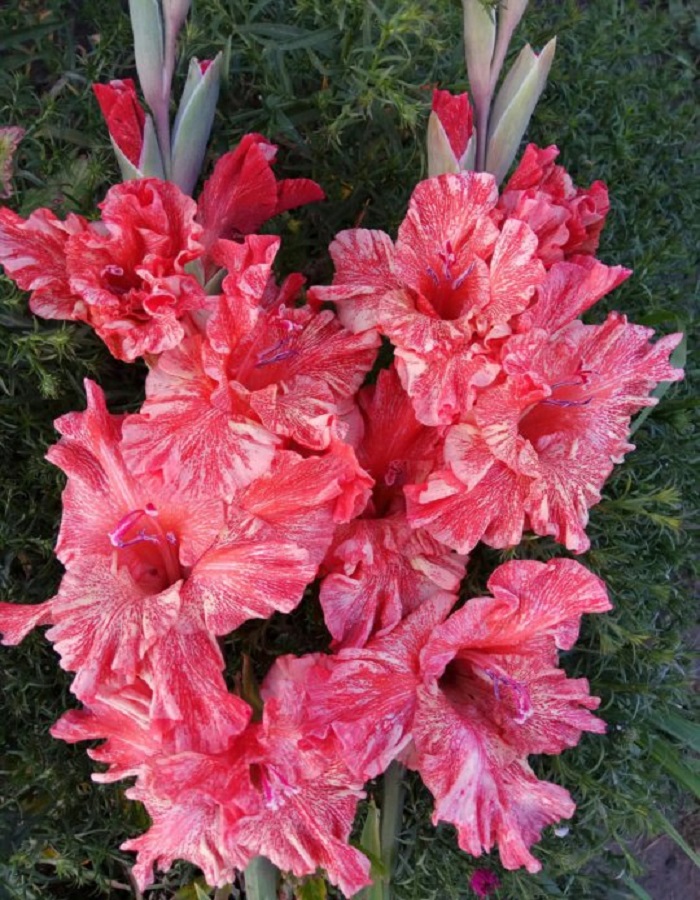 Гладиолус Муаровый Иней.Любители муаровых сортов не останутся равнодушными к этому сорту. Очень сильный муар! Плотный муар на красно-коричневом фоне придаёт эффект перламутра. Бутон округлый, гофрировка глубокая. Идеально двухрядный, фактура лепестка плотная.