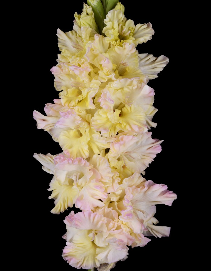 Гладиолус Порхание Бабочки.Бледно-розовато-сиреневый, переходящий в бледно-жёлтый на нижних лепестках. Сильно гофрирован мелкими частыми защипами. Цветки размером 11,5-14 см