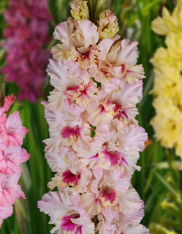 Гладиолус Прекрасное Далеко. Необычная окраска с перламутровыми переливами светло-сиреневых и тёмно-сиреневых тонов. На нижнем лепестке тёмно-сиреневые и кремовые наплывы. Прочный прямой колос с плотной укладкой цветов. Фактура лепестков очень плотная.