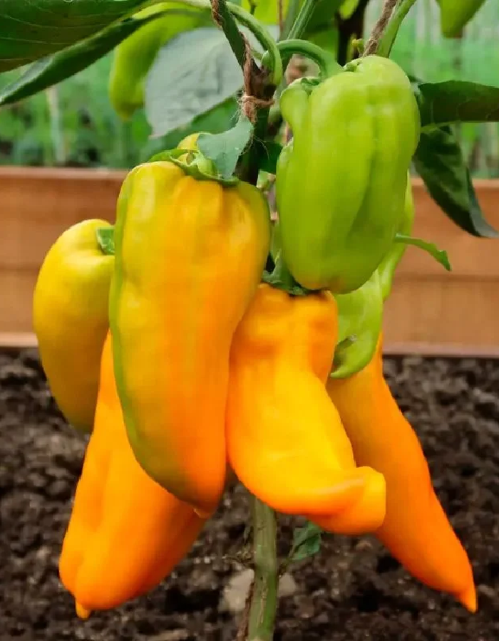 Среднеспелый сорт для плёночных теплиц, парников и открытого грунта. Период от всходов до начала плодоношения 115-130 суток. Растение высокорослое и раскидистое. Плод конусовидный, глянцевый, слегка ребристый. Окраска в технической спелости светло-зелёная, в биологической – ярко-жёлтая. Плоды очень крупные – до 350 г, ароматные. Они имеют очень толстую стенку — до 10 мм.