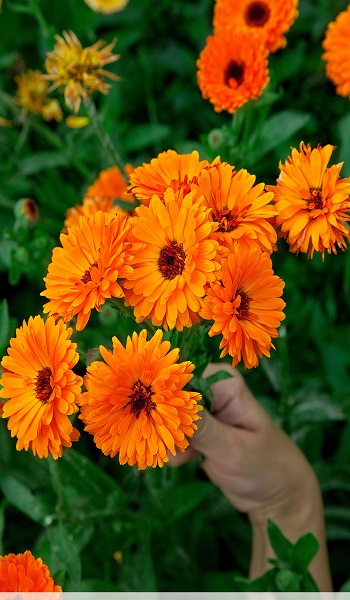 Превосходная срезка. Растение густоветвистое, высотой около 50 см. Соцветия крупные, диаметром 10 см, густомахровые, красновато-оранжевого цвета. Растение холодостойкое, выносит заморозки до -5С, предпочитает солнечные места, обладает лекарственными свойствами (антисептик). Цветет с июля по сентябрь. Используют для клумб, рабаток, бордюров и срезки.