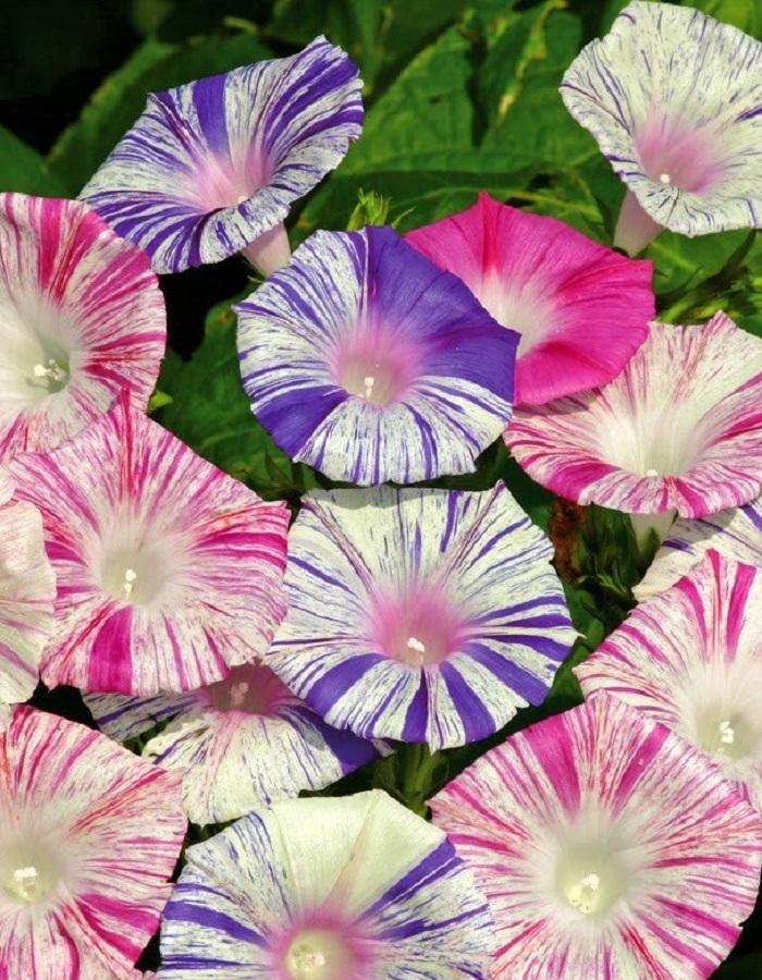 Пестрая оригинальная смесь. Эффектная яркая смесь для вертикального озеленения с побегами длиной до 2 м. Цветки воронковидные, крупные, диаметром до 12 см, белые с пестрыми розовыми и фиолетовыми полосками. Предпочитает солнечные места. Цветет обильно с конца июня до заморозков. Используют для озеленения балконов и  как клумбовое растение.