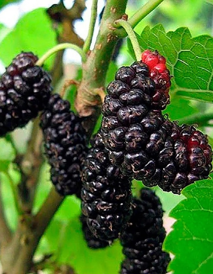 Шелковица (тутовник) Черная - среднего срока созревания, универсального использования. Очень интересны ее листья: разнообразной конфигурации и величины даже на одном дереве — от цельных до лопастных. Масса плода 5-10 гр., высота саженца 25-30см. Довольно декоративны соплодия — сладкие, съедобные, разнообразной окраски, слегка напоминающие по внешнему виду малину или ежевику. Хорошо переносит обрезку, а в молодом возрасте — пересадку. Использование: делают начинку для пирогов, изготавливают вина, водку-тутовку и безалкогольные напитки. Зрелый плод содержит большое количество ресвератрола, являющегося сильным растительным антиоксидантом. Плоды богаты витаминами и микроэлементами.