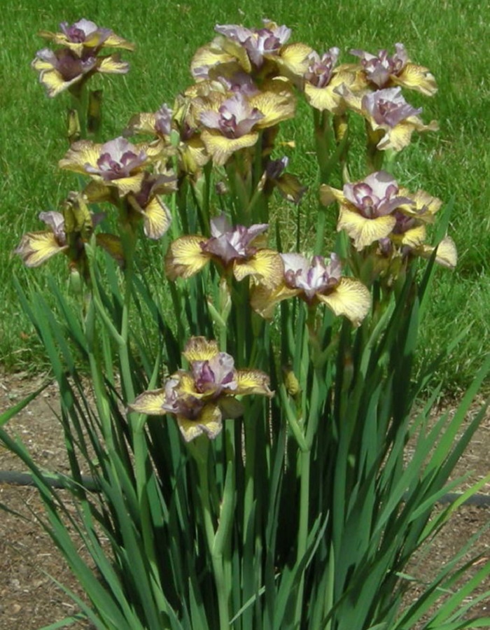 Ирис Фоллоу Зе Хани - желтый с бордово-фиолетовой сеткой, стандарты в центре кремовые с розовато-сиреневой широкой каймой, легкий аромат, цветение среднего срока, высота 86 см.