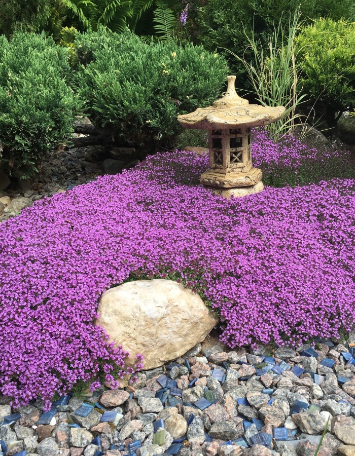 Яркости такому декору придают пурпурно-фиолетовые цветы. Цветет тимьян очень щедро - побеги буквально усеяны цветоносами, которые вытягиваются до 15 см в высоту. Зацветает преимущественно в июне-июле.