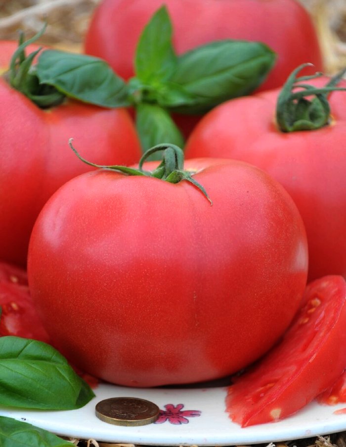 Среднеспелый срок созревания томата Король крупных, позволяет провести сбор урожая уже через 110-115 дней. Куст в среднем вырастает 200 см высотой. Плоды плоскоокруглые, довольно крупные, средней массой более 1 кг. Томаты красно-малинового цвета, сочные, мясистые, с малым количеством семян. Вкусовые и товарные качества у сорта отменные.